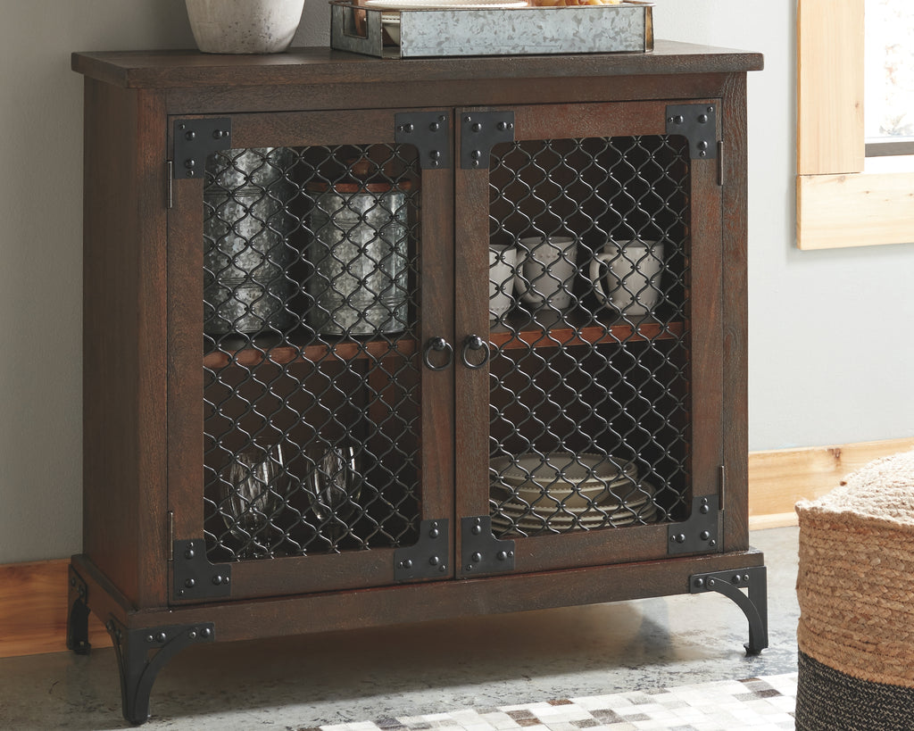 Be it for storing books displaying keepsakes or housing odds and ends this accent cabinet may be compact but its mighty practical. Charming touches include industrial-style brackets and metal mesh inlays on the double cabinet doors. Manufacturer Warranty: 0 Days