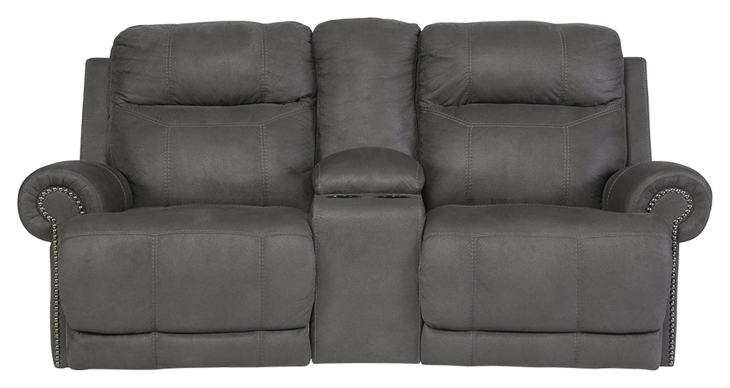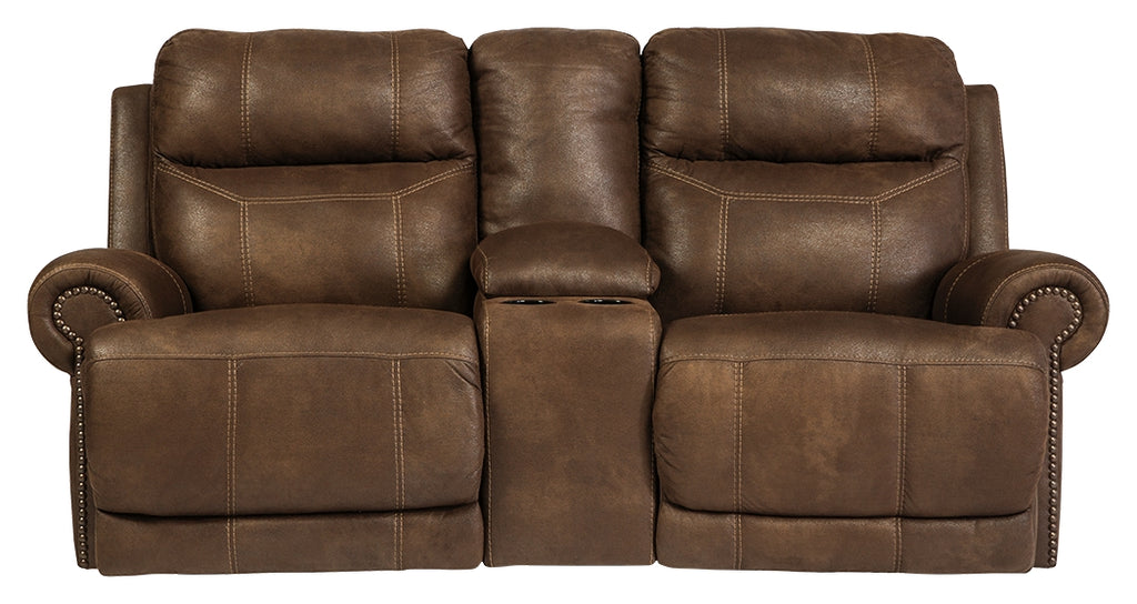 Sparing that puffy look you might expect from a recliner this reclining loveseat with console doesnt hold back when it comes to contemporary style. Subtle touches such as sporty jumbo stitching nailhead trim and a weather worn effect on the upholstery give this handsome piece a buttoned-up appeal and fresh feel. Center console with dual cup holders brings a handy element to this handsome piece.