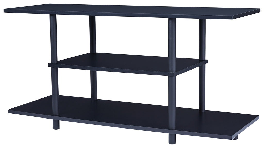 Watch TV in the modern practicality of this 42-inch TV stand. Designed with your enjoyment in mind this open shelf styled stand offers two shelves perfect for holding your media equipment. Youll be impressed with its big top ideal for accommodating TVs up to 42 inches wide. The matching lower shelf and smaller middle shelf will keep everything easily accessible. The large lower shelf with open ends can accommodate a pair of speakers or you can use the space to display large accessories. Manufacturer Warranty: 365 Days