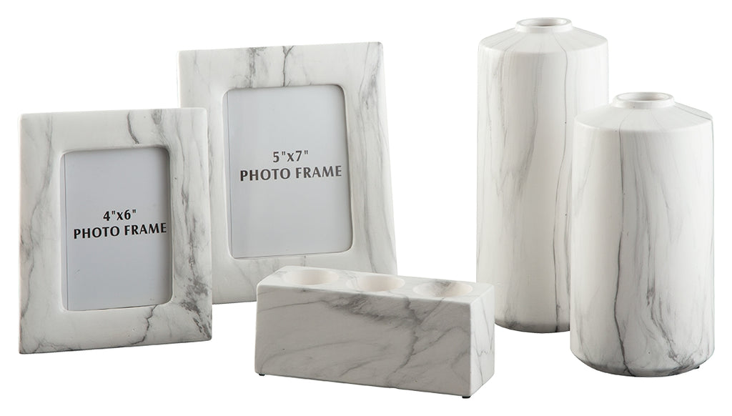 This 5-piece accessory set makes it easy to swap out your decor for a contemporary look. Dark veins in the white faux marble finish swirl beautifully. Put your pictures and favorite florals on display around the house. Light up the senses with 3 ambrosial candles in the candle holder. Manufacturer Warranty: 0 Days