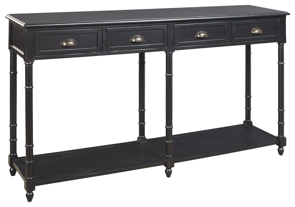 Need wide open shelf space for a decorative display This long console sofa table gives you ample room to work with plus bonus drawer space for keeping a clutter-free table top. Vintage elements like turned legs cupped drawer pulls and framed drawer fronts make this table perfect for drawing attention. Manufacturer Warranty: 0 Days