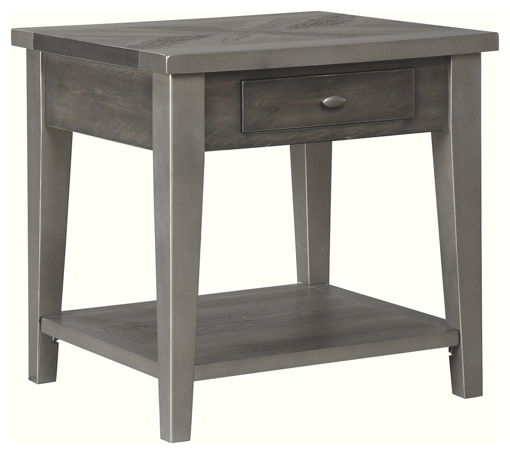 Simply striking yet remarkably detailed. Thats the beauty of this rectangular end table. Its clean-lined profile is greatly enhanced by a dramatic tabletop with butterfly veneer layup. And the finish So complex in a rustic gray tone with hints of aged metallic. Unique oval shaped hardware on the smooth-gliding drawer rounds out the look. Manufacturer Warranty: 365 Days