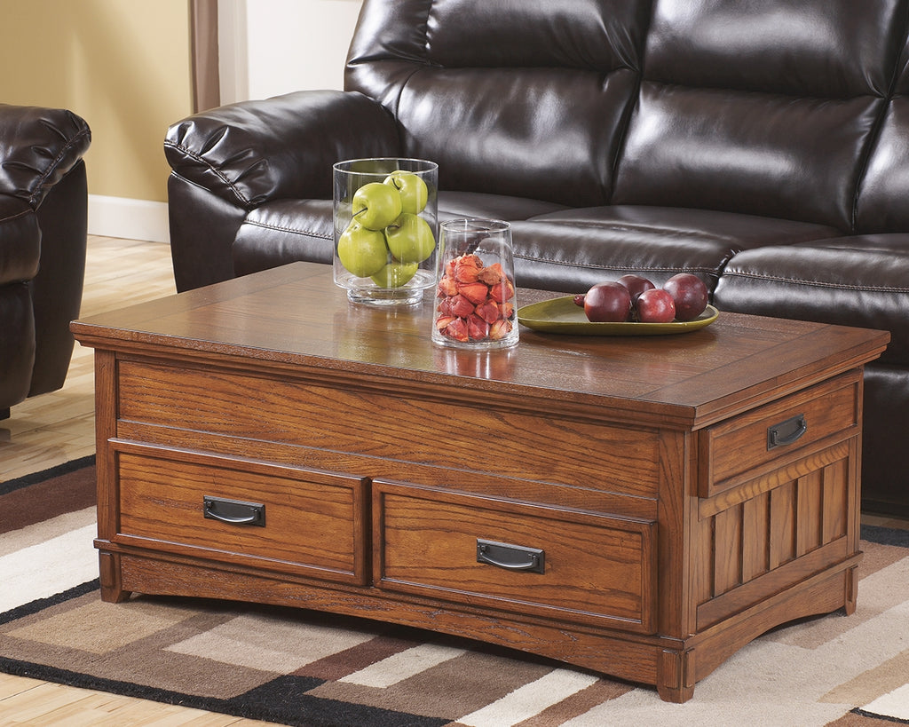 If youre on a mission to warm up your space with rustic refinement this Mission-inspired lift-top coffee table is packed with possibilities. A handy spring-loaded mechanism brings the tabletop to you. Casters offer the option of added flexibility. Front and side drawer space make it a handy hiding spot.