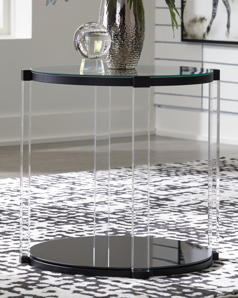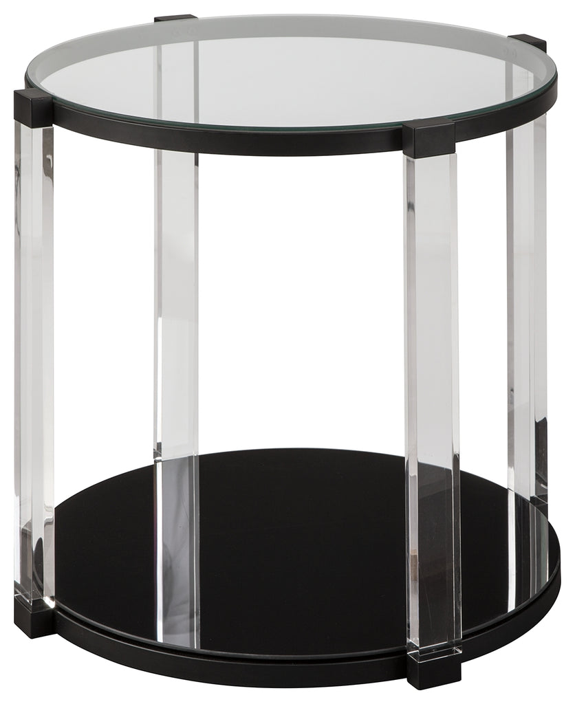 When it comes to contemporary style this round end table is a clear standout. A triumph in transparency this high-design end table pairs a clear tempered glass tabletop with see-through acrylic legs for less-is-more flair. Sleek black metal rim and bottom shelf take the cutting-edge look over the top.