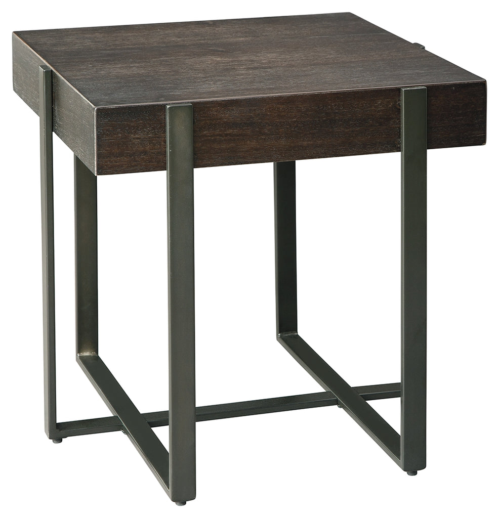 Pairing a thick slab-style top crafted of veneer and engineered wood with a linear metal base this end table is an achievement in urban-contemporary design. The aesthetic might be ultra cool but a dark brown finish with wire-brushed texturing keeps the feel warm and inviting.