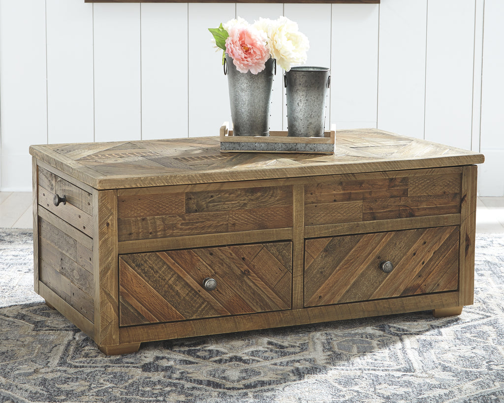 Why choose between rustic and contemporary when you can have the best of both in this lift top coffee table Loaded with charm and knotty character this high-quality piece is crafted with reclaimed pine wood treated to a light weathered pine color finish to enhance its natural grain and tonal variation. Chic chevron planking adds a fashion-forward element and gives this 4-drawer table a sense of flair and refinement. Convenient spring-lift design transforms your space into an instant workplace. Manufacturer Warranty: 365 Days