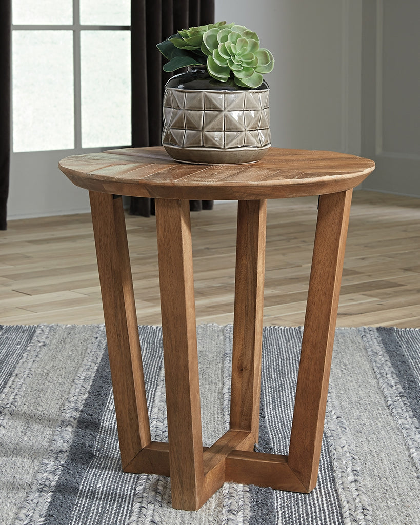Round out your seating area with this end table in a contemporary round design. Angled legs are simple yet strikingwhile its planked mango wood top is anything but ordinary. A rich waxy finish enhances the woods tonal variation for a look sure to entice.