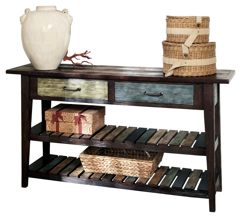 Bring a splash of subtle color and relaxed sensibility into your space with this sofa table. Whether youre going for an island-breeze vibe or a rustically refined look this eclectic piece will fit right into your design scheme. The slat-style shelving dotted with a multitude of sunburnt shades sets the stage to showcase books baskets or favorite accent pieces. Manufacturer Warranty: 365 Days