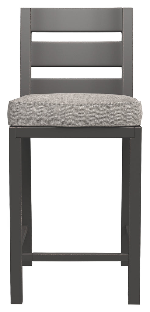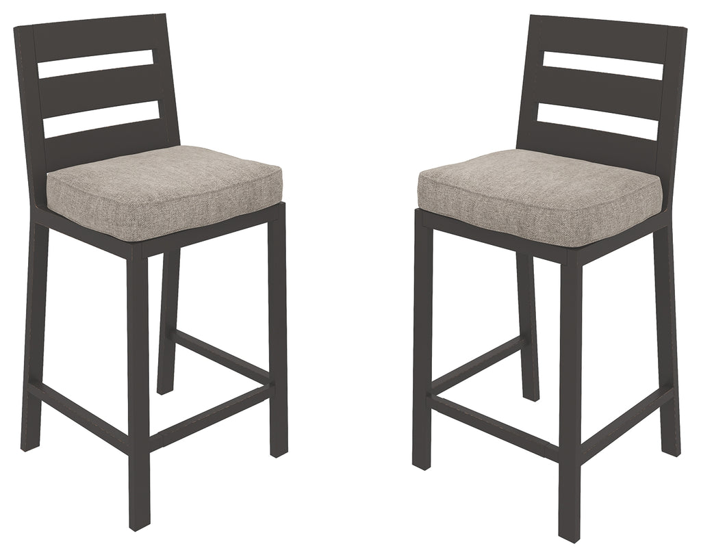 Cool style made for warm memories. Thats the beauty of this outdoor bar stool. Finished in a rich dark brown with distressed look accents the rust-proof aluminum bar stool with crisp and clean slat-back styling is made to last. The sumptuously thick seat cushion is removable and wrapped in high-performing Nuvella fabric for easy-breezy care. Manufacturer Warranty: 365 Days