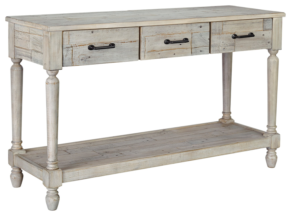 With its distinctive whitewash finish plank-effect styling and distressed touches that lend a reclaimed sensibility this sofa table serves up a delightful twist on farmhouse style. Crafted with solid pine wood this sofa table sports three storage drawers and underlying shelf for that much more character. Manufacturer Warranty: 365 Days