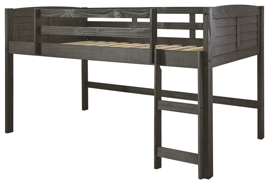 Sporting a distinctive weathered gray finish and charming louvered details this twin loft bed frame is sure to raise your expectations when it comes to kids furniture. Complete with a sturdy ladder quality wood slats that eliminate the need for foundationbox spring and protective guard rails this kids loft bed frame is a warm and inviting choice in casual rustic style. Mattress available sold separately. Manufacturer Warranty: 365 Days