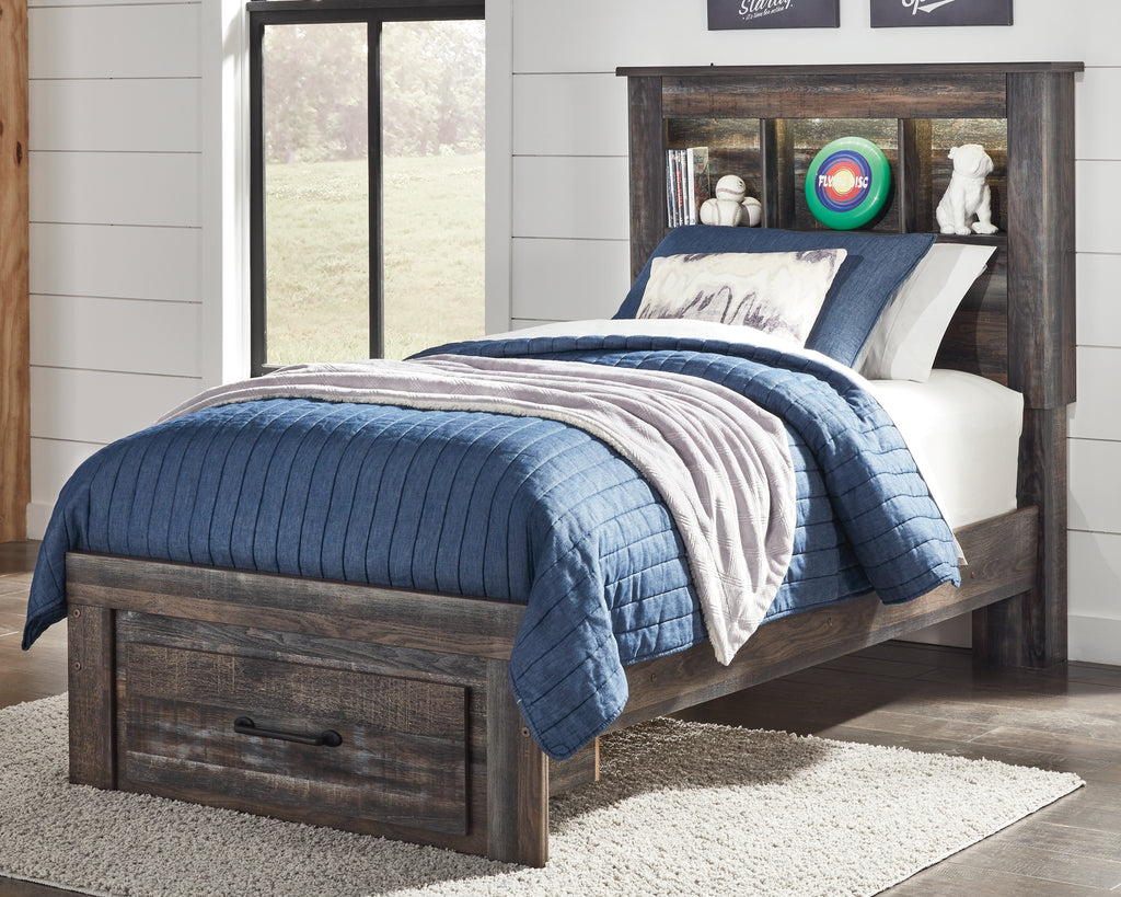 When merged in just the right way rustic and industrial styles can make one happy marriage. Case in point this twin bookcase bed with storage. A refined take on barn board beauty its complex replicated wood grain showcases hints of burnt orange and teal tones for a sense of weatherworn authenticity. Three open cubbies lined with a dimming LED light strip keep bedtime reads top of mind. Drawer storage at the foot of the bed comes in mighty handy. Mattress and foundationbox spring available sold separately. Manufacturer Warranty: 365 Days