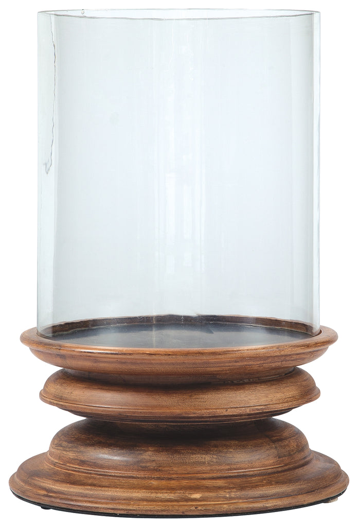 Cast a charming glow in your home with this candle holder. Its simple to create a quaint dreamy mood with candlelight flickering behind clear glass. The carved wood base adds an elegant touch to this understated piece. Manufacturer Warranty: 0 Days
