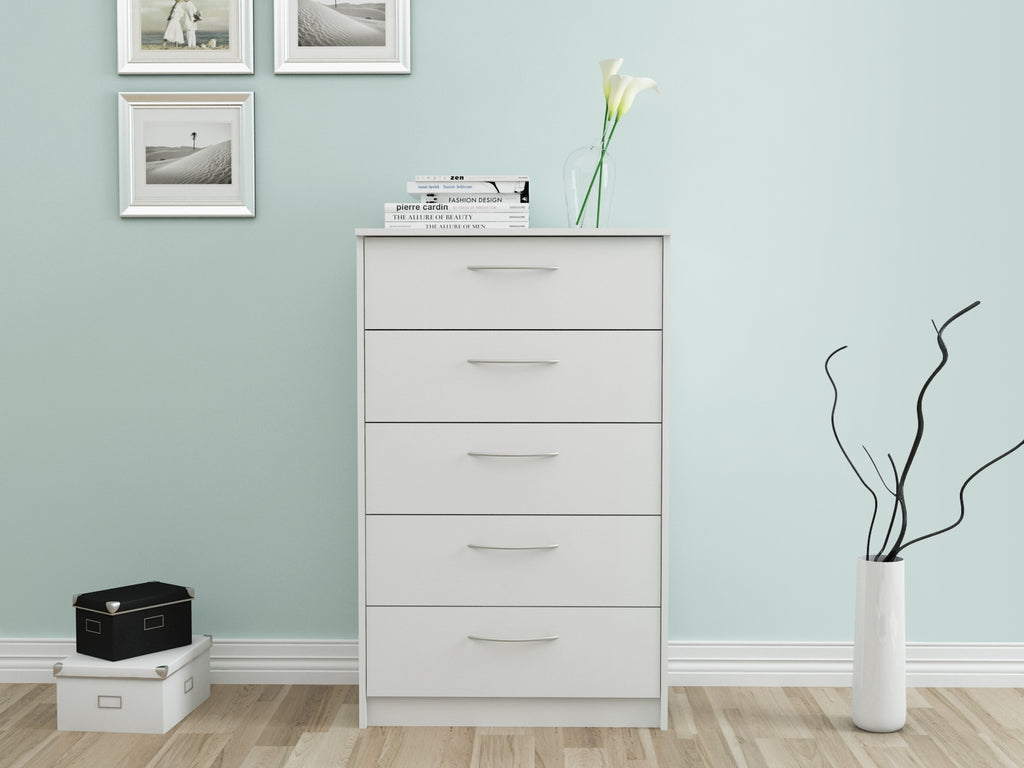 This 5-drawer chest has simple lines and contemporary styling allowing it to blend seamlessly with any decor. Five spacious drawers will keep your clothes neat and organized. Combine with other units in the collection to create a room thats stylish and practical. Manufacturer Warranty: 365 Days