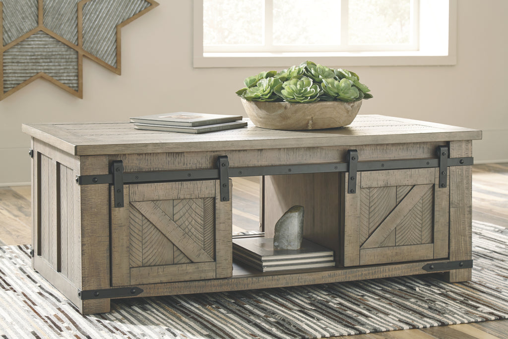 Crafted with solid pine wood treated to a weathered gray finish this storage coffee table is rustic farmhouse living at its best. Sliding barn doors reveal divided cabinet space that fuses form and function. Metal brackets incorporate an industrial twist. Manufacturer Warranty: 365 Days