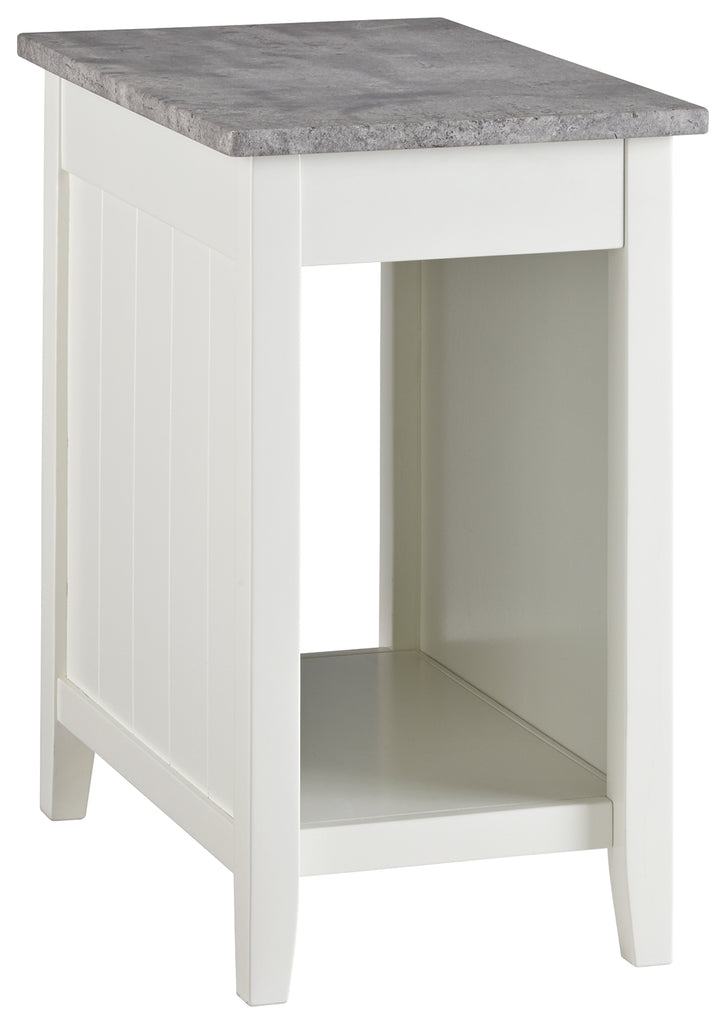 Searching for a less-is-more look This chairside end table in crisp clean white is sure to delight. Faux concrete styling on the tabletop gives the minimalist aesthetic an earthy element. And with AC powerUSB slots on the side this simply chic chairside end table has the corner on form and function.