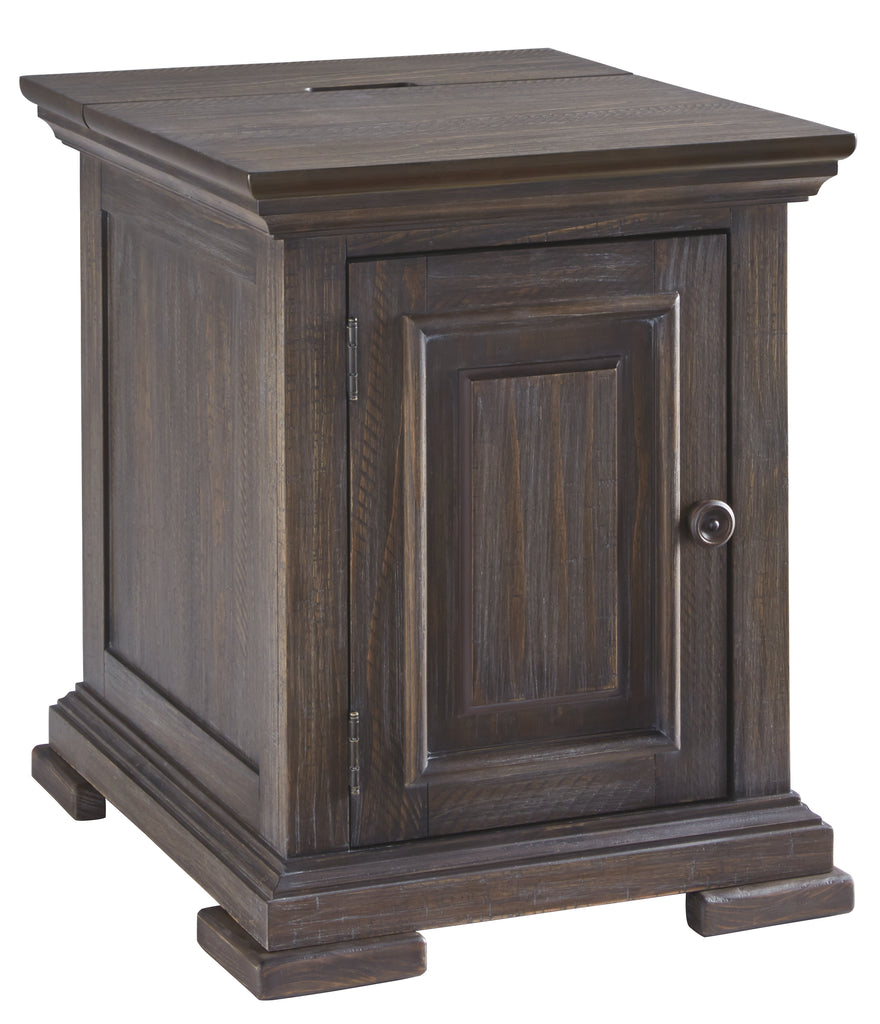 Inspired by heavy and hearty lodge-style furnishings from days gone by this chairside end table brings the past brilliantly into the present. Distinctive details include robust mouldings and a distressed aged pine color finish with light wire-brushed texture thats pure artistry. Addition of cleverly placed AC power and USB plug-ins makes this yesteryear-inspired end table made for the here and now.