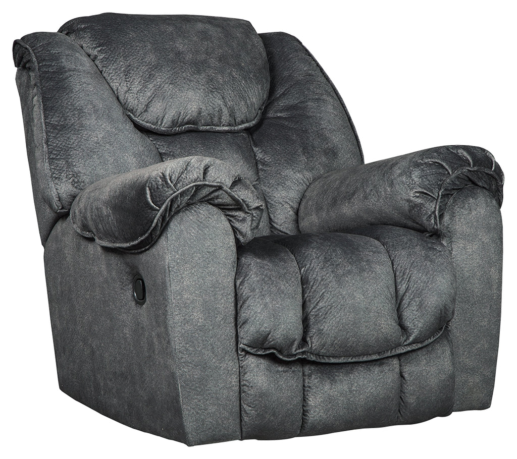 Sometimes seeing is believing. Rest assured this rocker recliner is every bit as indulgent as it looks. Designed to put you in the lap of luxury this generously scaled reclinerwrapped in a wonderfully plush and practical granite gray upholsterysports scooped pillow wrapped armrests and curvaceously cushioned head-neck support for feel-good flair. Manufacturer Warranty: 365 Days