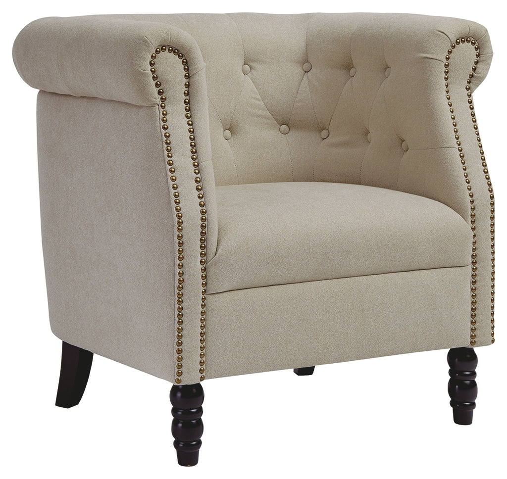 Bring a European style to your home with this accent chair. The soft beige color is sophisticated and subtle while the tufted barrel back and turned wood legs evoke an air of exclusivity. Make your space your own private club with this uptown piece. Manufacturer Warranty: 0 Days