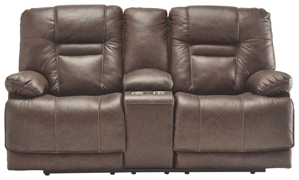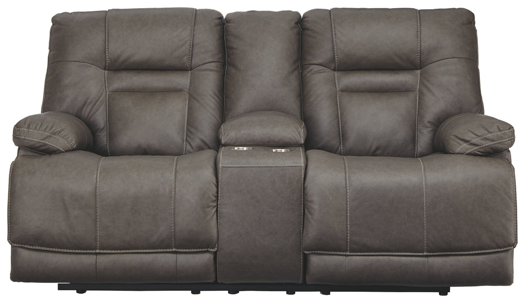 Big and bold this power reclining loveseat with console and Easy View power adjustable headrests delivers comfort at the touch of a button. Easily position the recliner its headrest and lumbar support to your liking for maximum comfort. Plus with the convenient USB charging ports cell phones or laptops can be charged without having to get up. The feel of heavy weight leather surrounds you via the cushioned seat interior bustled back cushioning and pillow top armrest while faux leather is on the back and sides for affordability. The cloud effect seen in the umber-colored upholstery creates a rustic look ideal for your modern or casual setting. The center console tops off convenience with hidden storage under center armrestperfect for tucking away remotes. Youll love keeping drinks within reach with the two stainless steel cup holders. Manufacturer Warranty: 365 Days