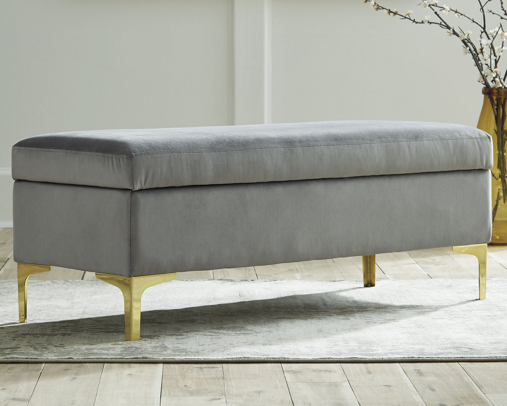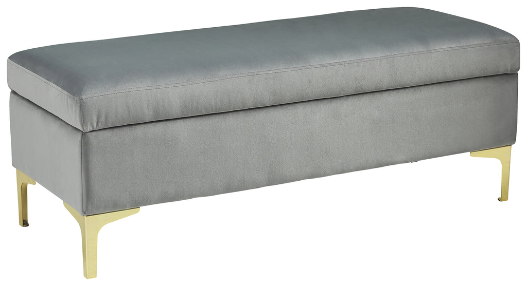 Is your home missing that one last special touch This storage bench does the trick. Its fresh modern edge is amplified with soft gray velvet fabric and swank goldtone legs. Storage function makes this more than just a fashion piece. Lift the top to quickly tuck away excess clutter. Manufacturer Warranty: 0 Days