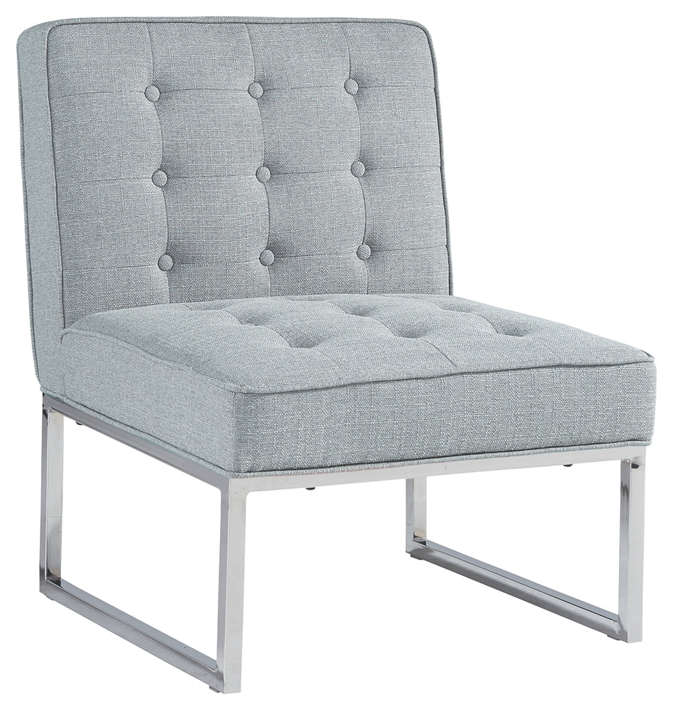 Button-tufted seat Yes please. This armless accent chair allures with contemporary appeal. Gorgeous chrome-tone base supports two comforting ivory cushions. Its neutral aesthetic complements your home with an upscale touch. Manufacturer Warranty: 0 Days