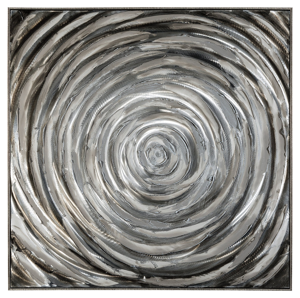 Get lost in the mesmerizing circle design of this wall art. Shades of gray silver and black are elevated with aluminum accents. Texture is so great that it almost looks wet. Manufacturer Warranty: 0 Days