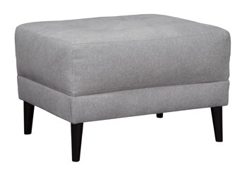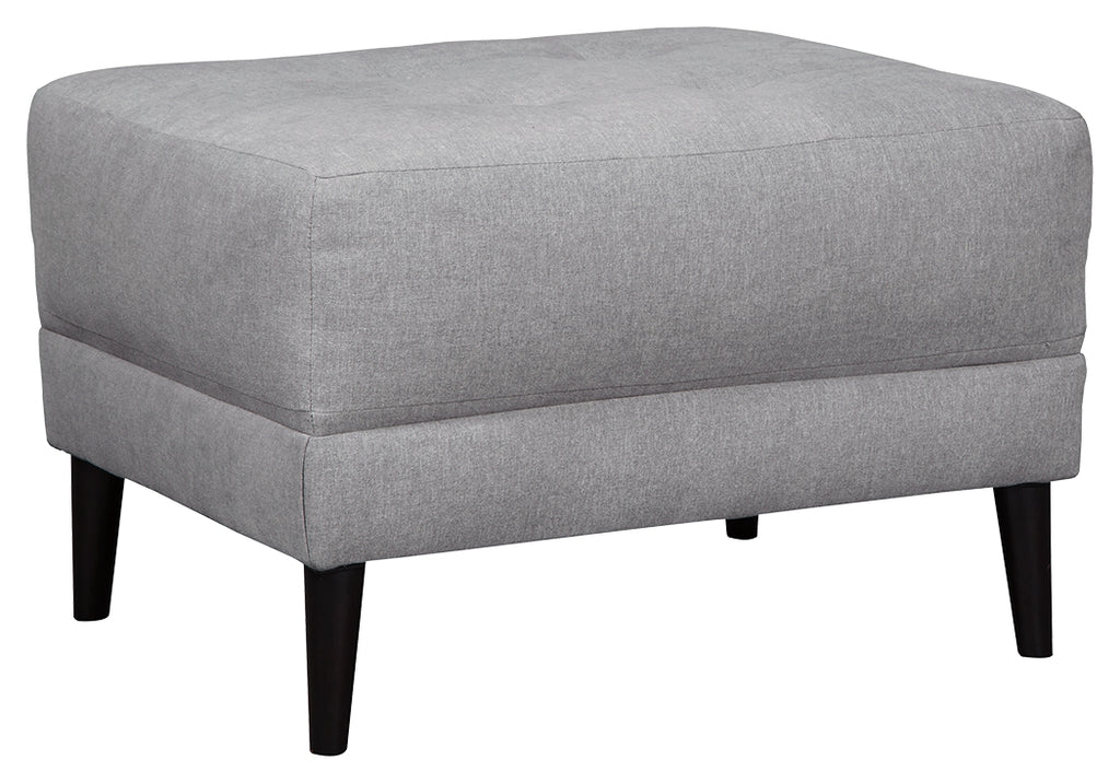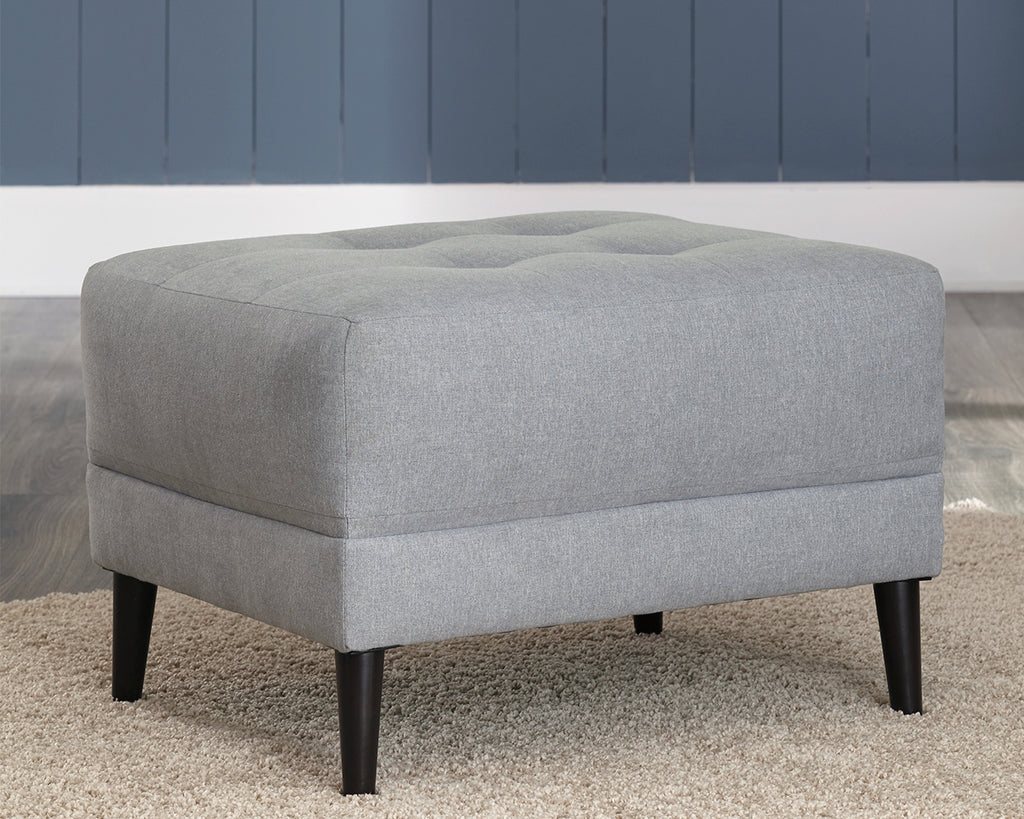 Effortlessly blending mid-century design with todays fashion this ottoman is a standout piece. Tapered accent legs set a sturdy and confident demeanor. Casual soft upholstery with in vogue neutral gray tone is easy on the eyes and feet. Mod cushion is extra thick for extra comfort. Manufacturer Warranty: 365 Days