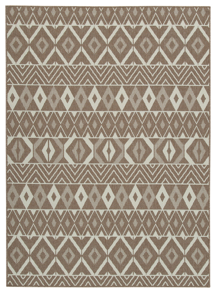 Inviting cool style inside and out this area rug in cream and tan entices with its updated twist on tribal. Made for indoor and outdoor use it merges a high-design look with low-maintenance care. Manufacturer Warranty: 0 Days