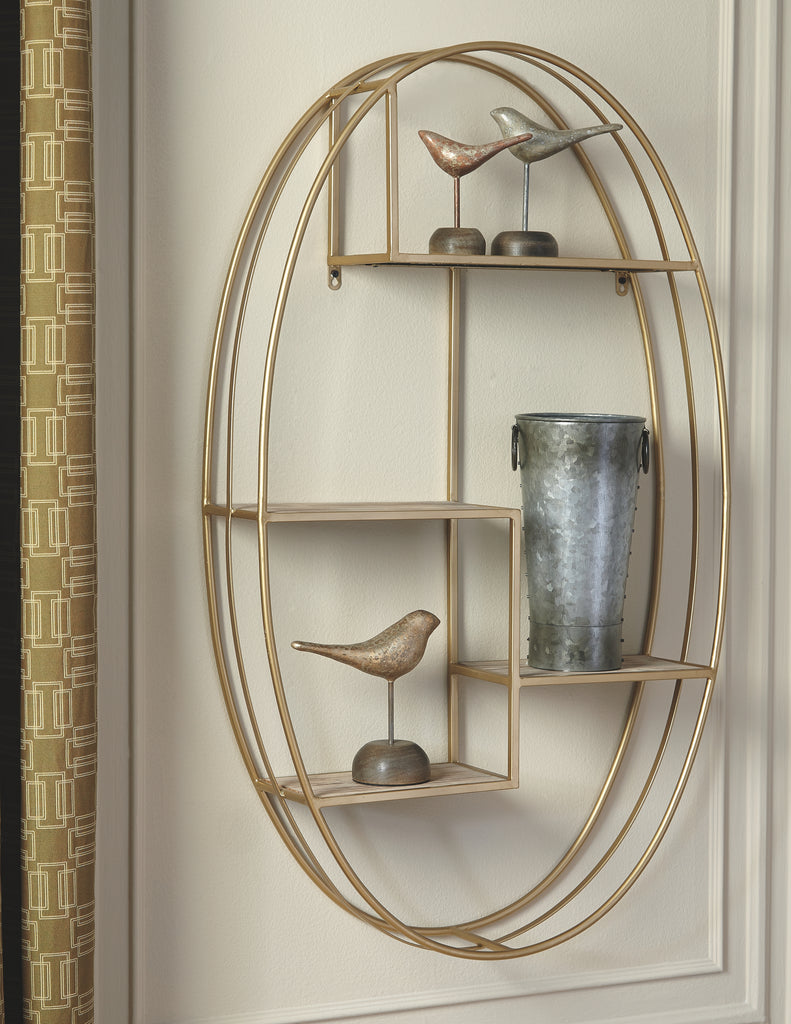 This wall shelf is an unexpected and striking combination of goldtone metal and natural wood. Ellipse design has an earthy luxe feel. Hang it up and adorn the four open shelves with trendsetting accessories. Manufacturer Warranty: 0 Days