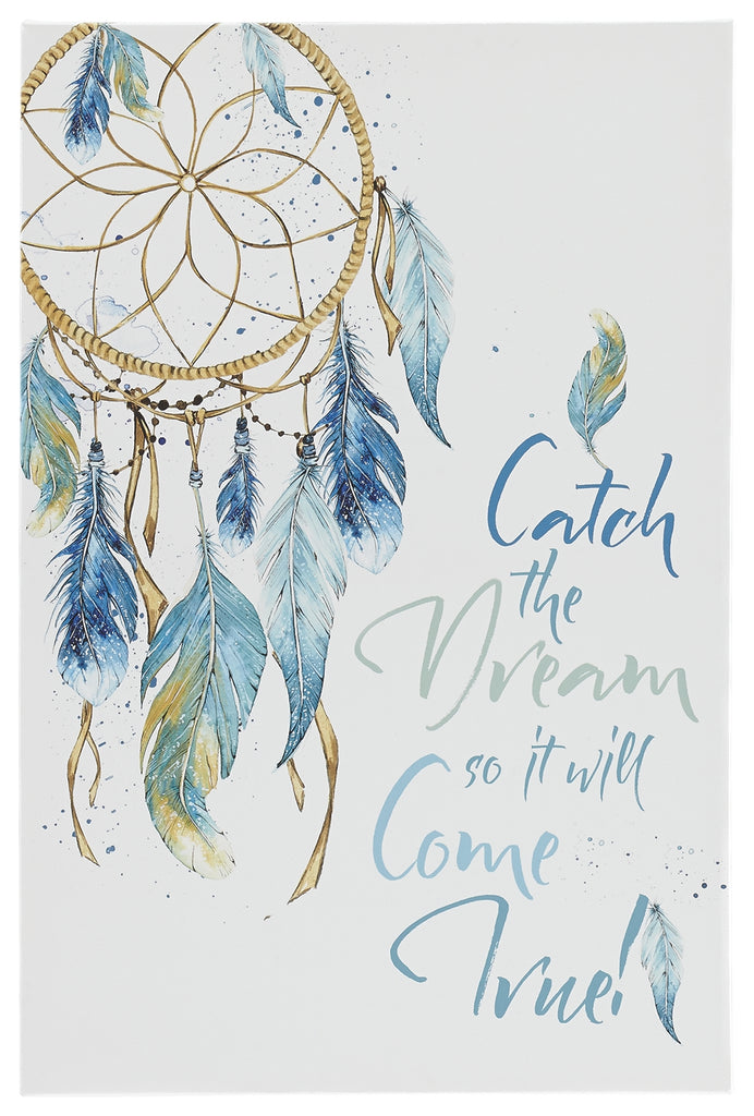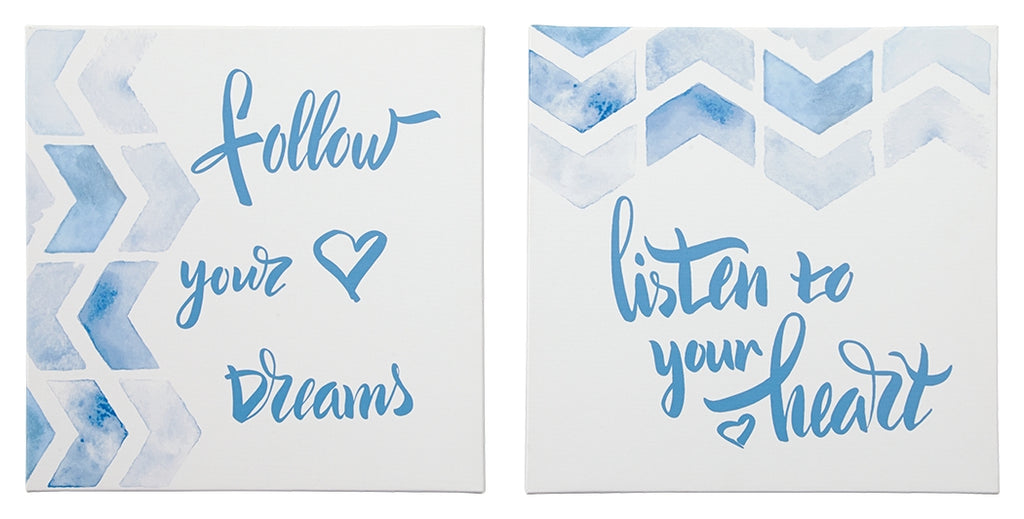 Wispy in light faded blues this wall art set holds a sense of serenity for the avid dreamer. A faded herringbone print creates the illusion of being up in the clouds and inspirational quotes coddle your childs artistic heart. Hang up this pair of canvases side by side or spread the inspiration throughout the room. Manufacturer Warranty: 0 Days