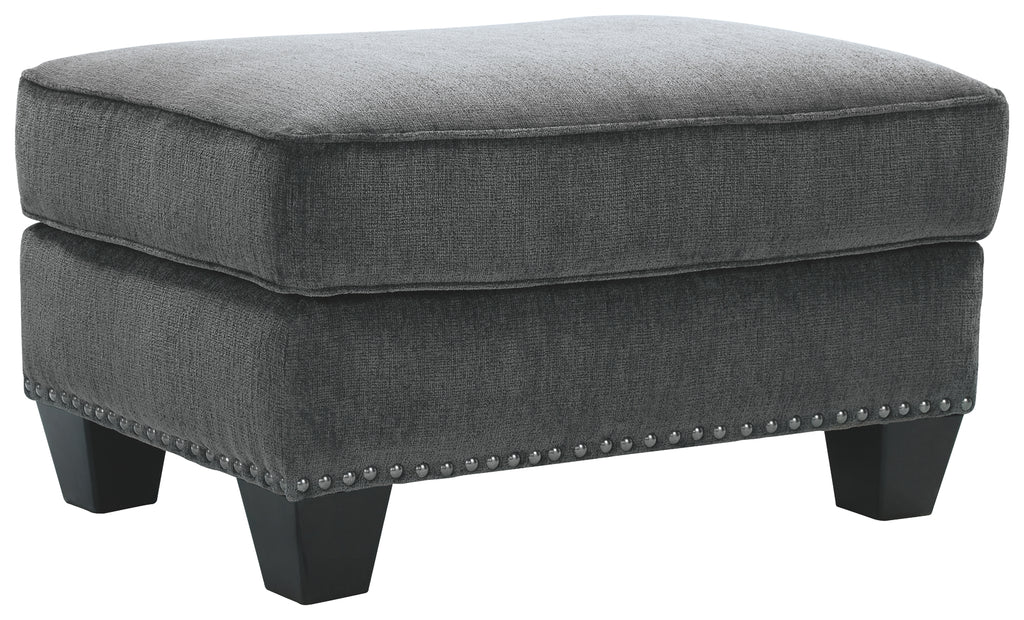 Time to go gray Find your fill of comfort style and sophistication in this designer ottoman. Its smoky gray upholstery is sumptuously soft to the touch and beautifully on trend. Ultra clean lines punctuated with black nickel-tone nailhead trim give this gorgeous gray ottoman a cool contemporary edge. Manufacturer Warranty: 365 Days