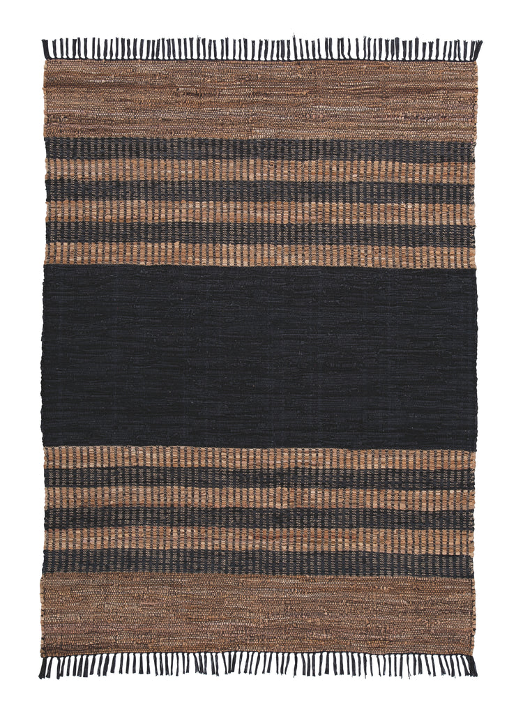 Woven with recycled leather strips cotton and jute this striped area rug invites you to go natural. Flirty fringe adds just enough flair. Posh palette of black and brown makes such a cool understatement. Manufacturer Warranty: 0 Days