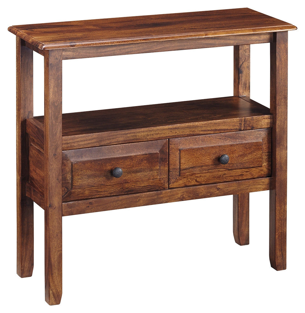 Beautifully crafted of solid acacia wood this accent table merges quality construction with richly rustic good looks. Beveled fronts on the pair of smooth-gliding drawers give the clean-lined profile a touch of added dimension.