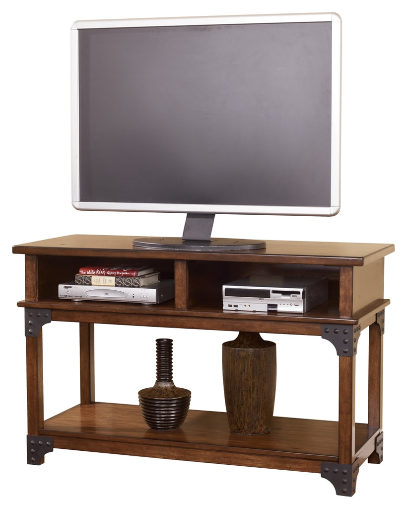 This sofa console table takes a different turn on vintage style. The ruggedly handsome metal brackets and studded accents are undeniably cool and a touch industrialbut the feel is warm and rustic.