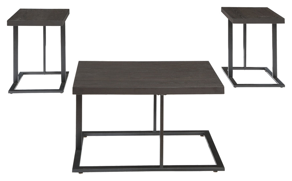 Style gone askew. This coffee table set goes off center in a beautiful way with an eye-catching cantilevered design. Sleek metal base in an aged bronze tone is a seamless merge with wire-brushed veneer tabletop with an earthy element. Manufacturer Warranty: 365 Days