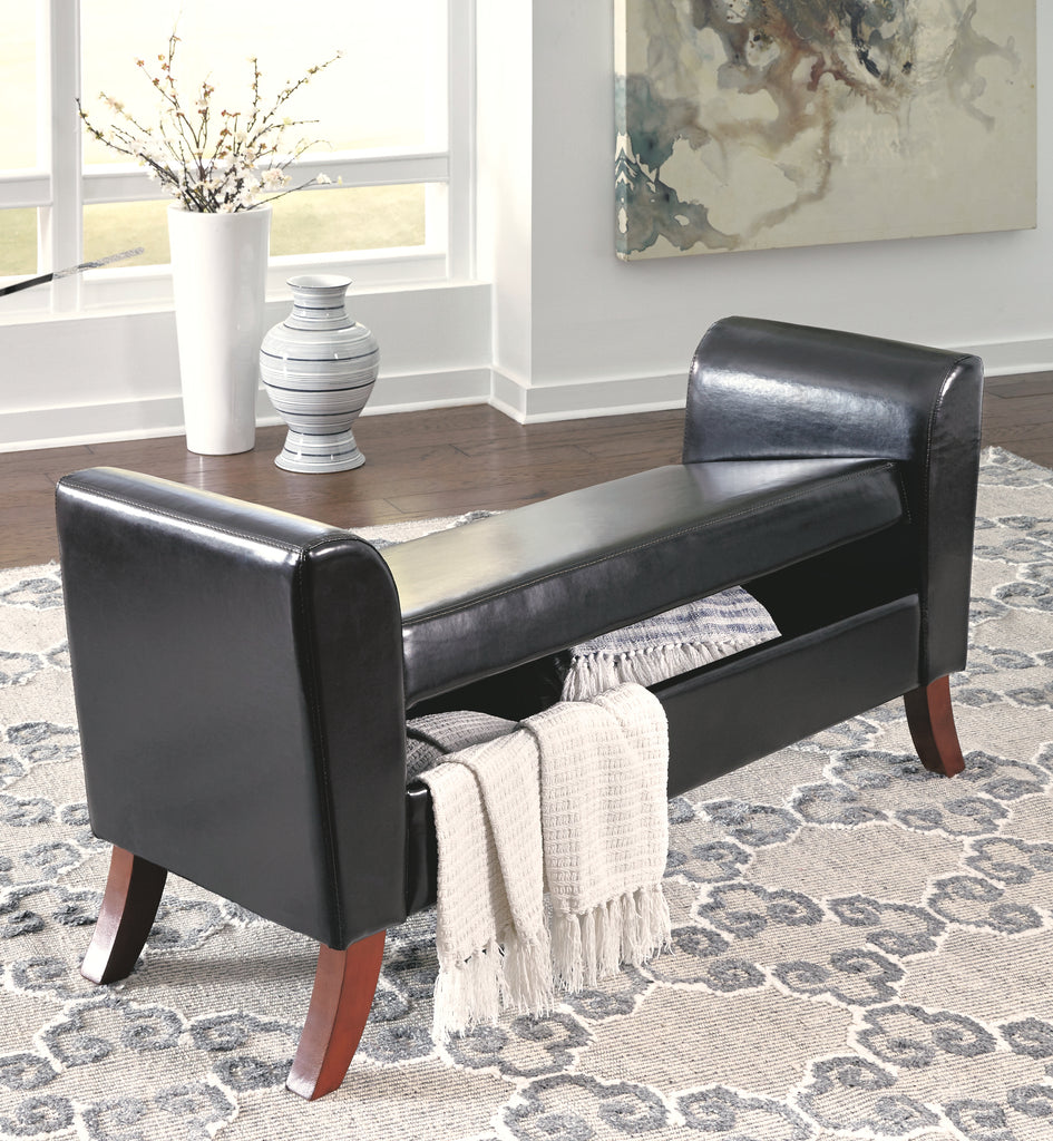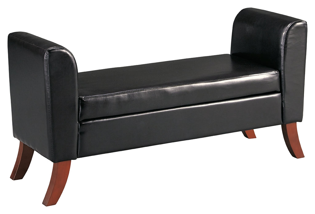Theres more to this upholstered storage bench than what meets the eye. Supple faux leather upholstery provides a comfy sitting area. Lift up the seat cushion to reveal lots of storage underneath. Coupled with curved legs and flared ends this bench is full of form and function. Manufacturer Warranty: 365 Days