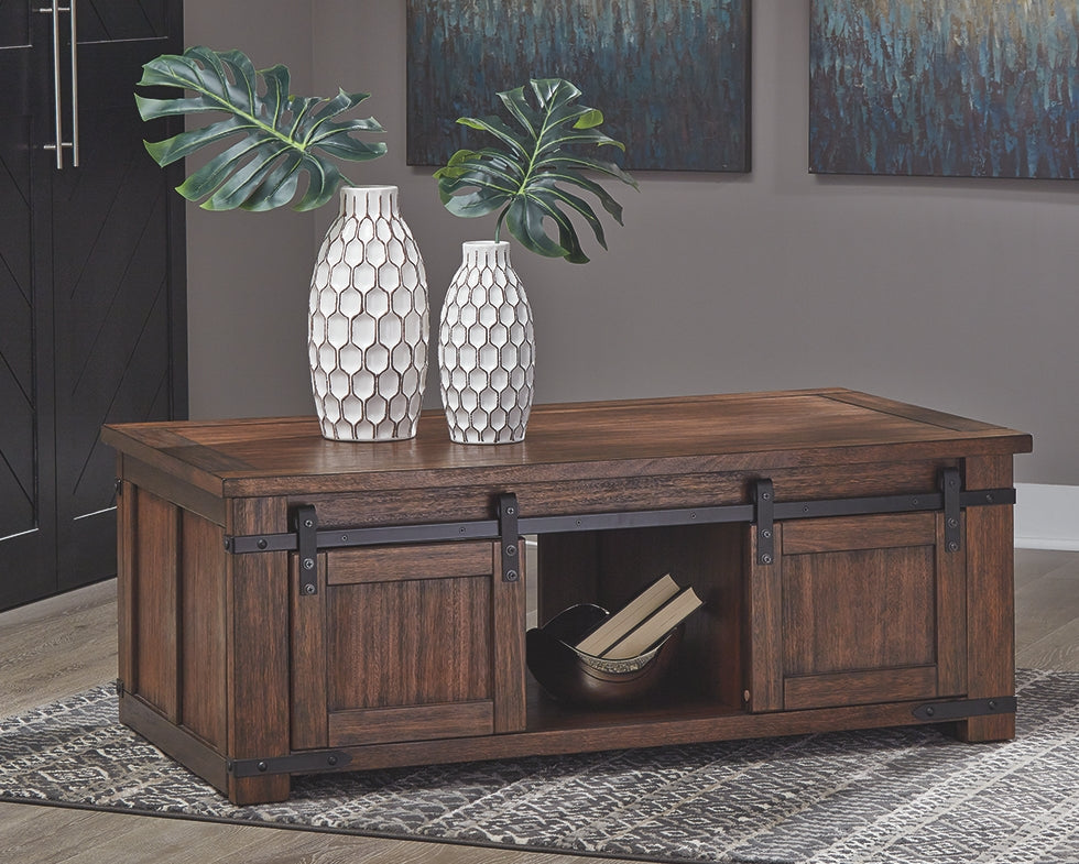 Roll with the ease of a coffee table on casters in farmhouse style. This rectangular table garners attention with its smooth sliding barn doors distressed rustic finish and black metal accents. With hidden storage behind its barn doors youll love the extra space for stashing items you want to keep within reach. If you need to move this table its casters make it simplewhat a value for adding down-home style with functionality to your living space. Manufacturer Warranty: 365 Days