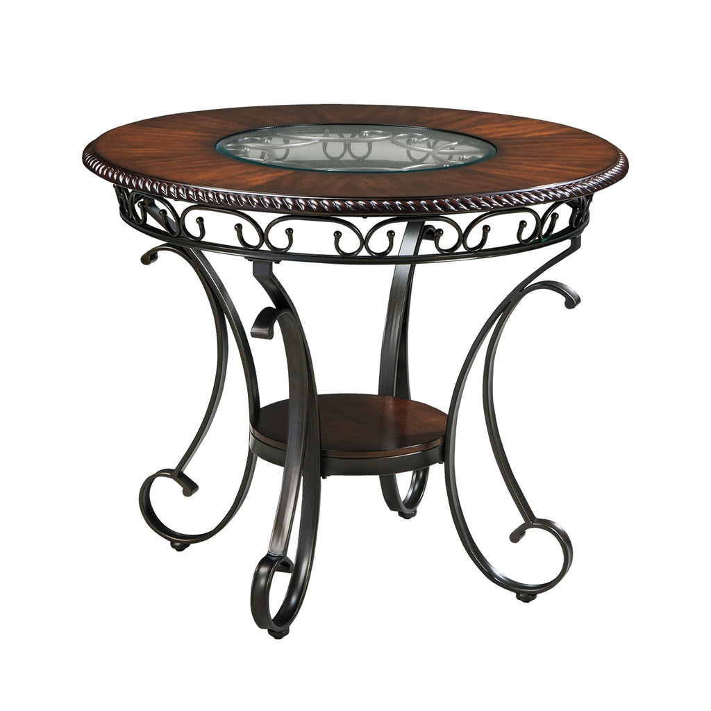 Incorporating a touch of European influence with its scrolled metal accents this striking dining room counter table mixes various textural elements and rich earth tones in a way thats so pleasing to the palette. We love how the circular inset glass on the dark finished tabletop serves up light and airy contrast. Whether youre looking to entertain or simply make the best of your nest do it with flair. Manufacturer Warranty: 365 Days