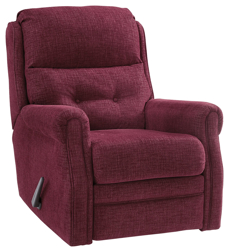 This chenille-textured recliner grants you the resting power you deserve. Refined sizing saves space without sacrificing comfort. With just one pull it reclines to the position of your liking. And talk about style. Gorgeous burgundy hue is accompanied by slim arms and button tufting on the lumbar cushion. Manufacturer Warranty: 365 Days