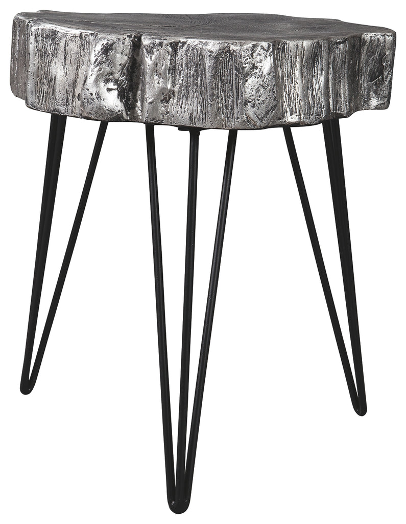 High style faux real. A fresh twist on rustic refinement this artificial wood slice table is a true standout. Antiqued silvertone finish gives its remarkably realistic tabletop cut-above flair. Manufacturer Warranty: 0 Days