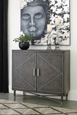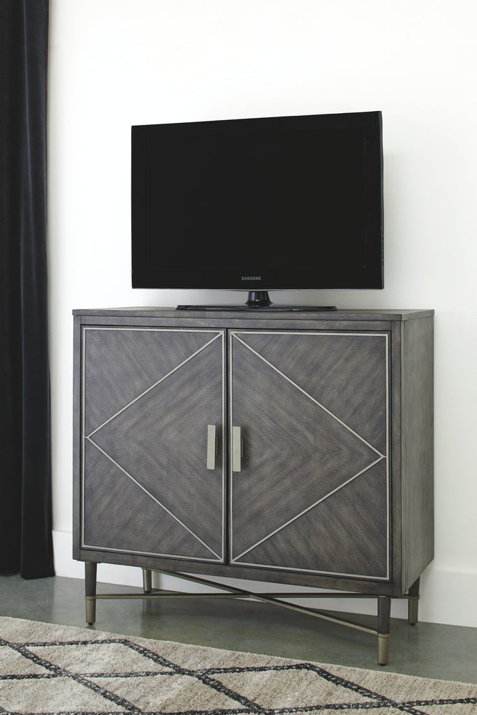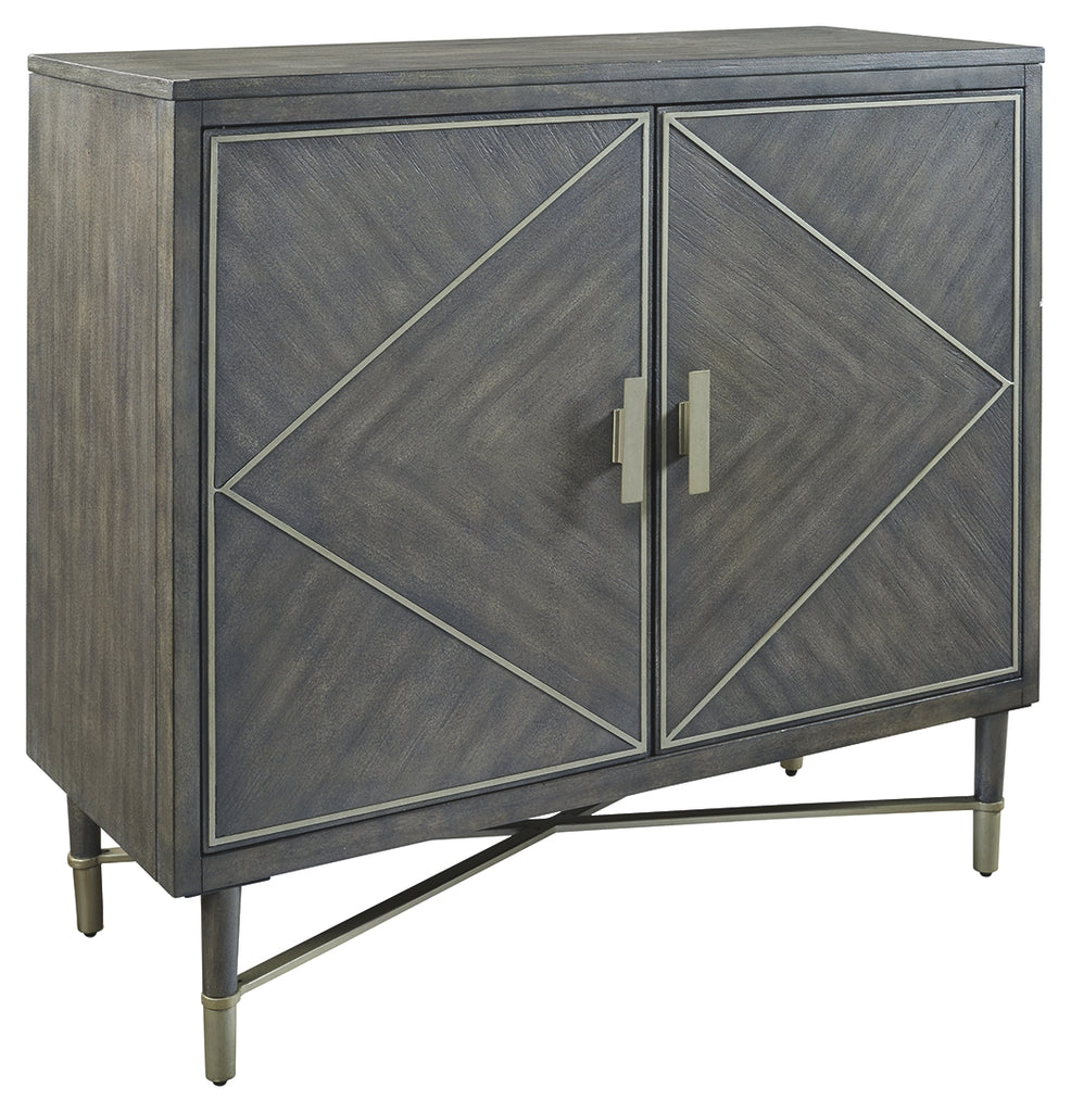 How many triangles do you see Theyre laid out in style on this accent cabinet. Linear wood design finished in antiqued gray is absolutely handsome. Pewter-tone finished metal accents add long-lasting fashion to your home. Look behind the doors for two convenient shelves giving function to form. Manufacturer Warranty: 0 Days