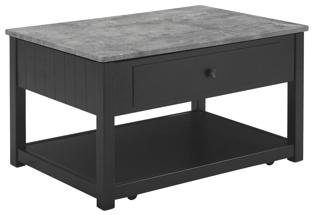 Pairing a faux marble top in gray with a brilliant black base this lift top table makes a simply striking statement. A generously sized drawer adds to the form and functionality. Optional casters provide welcome flexibility. Manufacturer Warranty: 365 Days