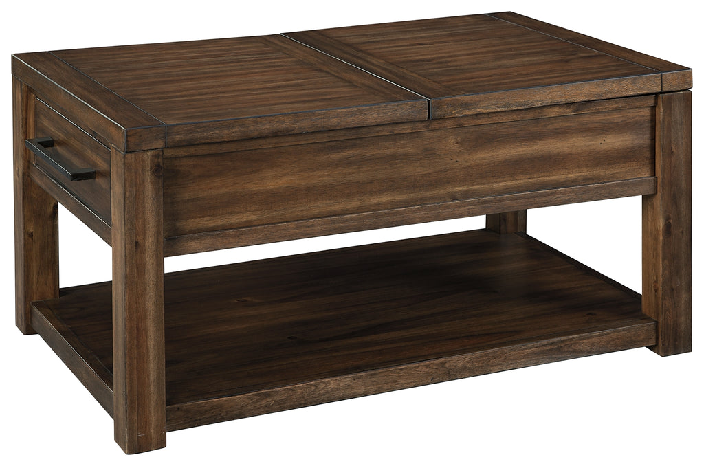 Stock up on homey hearty character scale back on fuss with this lift top coffee table. Its clean-lined chunky silhouette is right in line with your love of simplicity. Spicing things up a robust nutmeg brown finish to bring out the beauty of the wood grain. Split-lift top drawer storage and display shelf take form and function to a new level.
