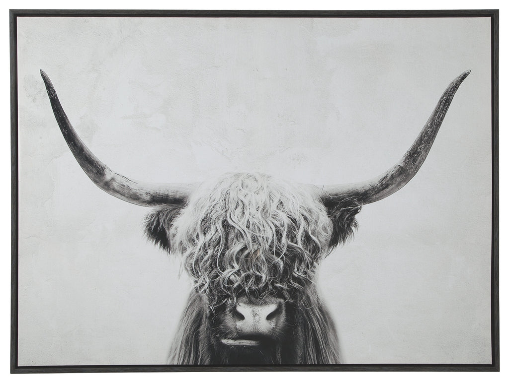 Bring home a piece of Scottish livestock with this wall art. Highland cow looks straight ahead with shaggy hair and prominent horns creating a beautiful white negative space. Sleek black frame creates a boundary and makes a statement in your home. Manufacturer Warranty: 0 Days