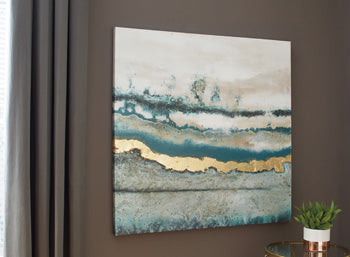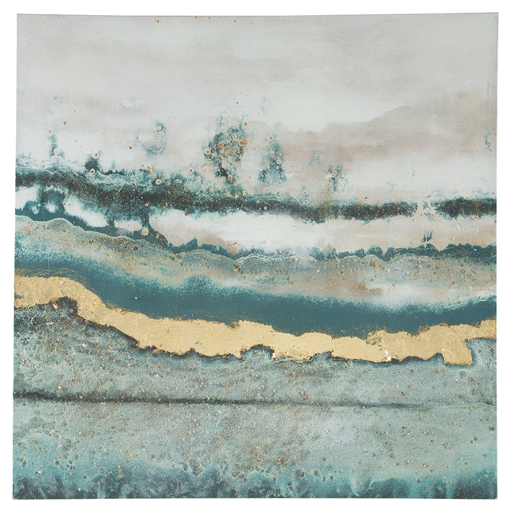 This wall art showcases a serene sea abstraction. Shades of turquoise and white flow with rhythmic depth embellished with gold leaf. Textured element of the hand-painted visual makes each piece a unique beauty. Its contemporary appeal elevates your neutral room with style and color. Manufacturer Warranty: 0 Days